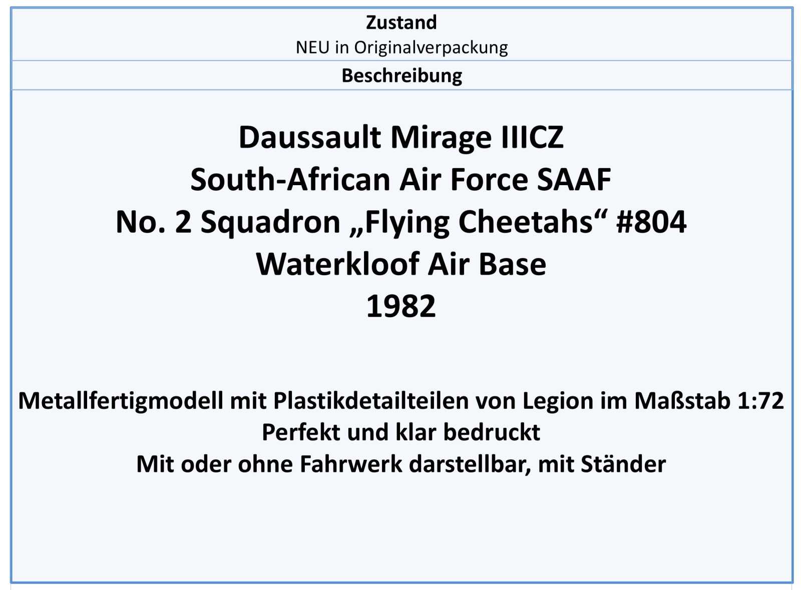 14648PF Mirage IIICZ SAAF -Flying Cheetahs-, 1982, Legion 1:72,NEU 2/2026 - Bild vergrößern