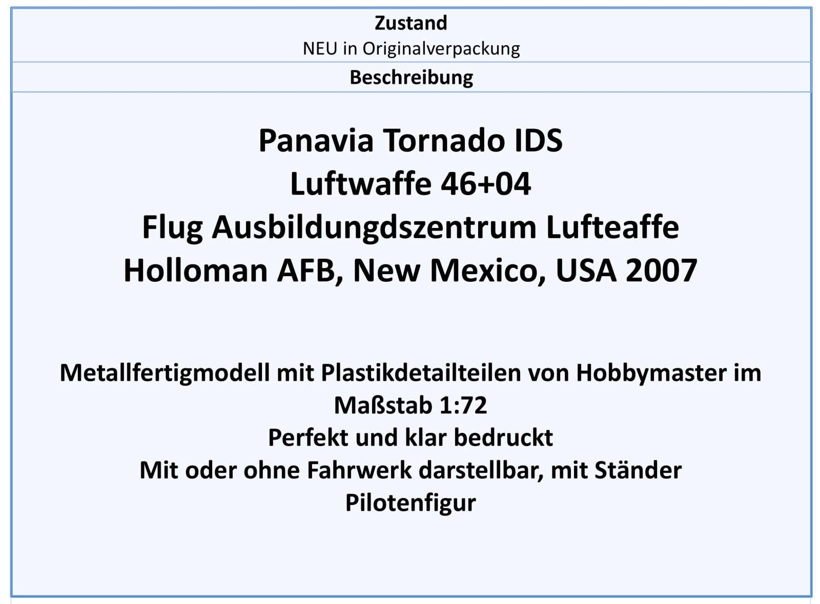 HA6724 Tornado IDS Luftwaffe FlgAusbZLw Holloman AFB 2007,Hobbymaster 1:72,NEU 11/25